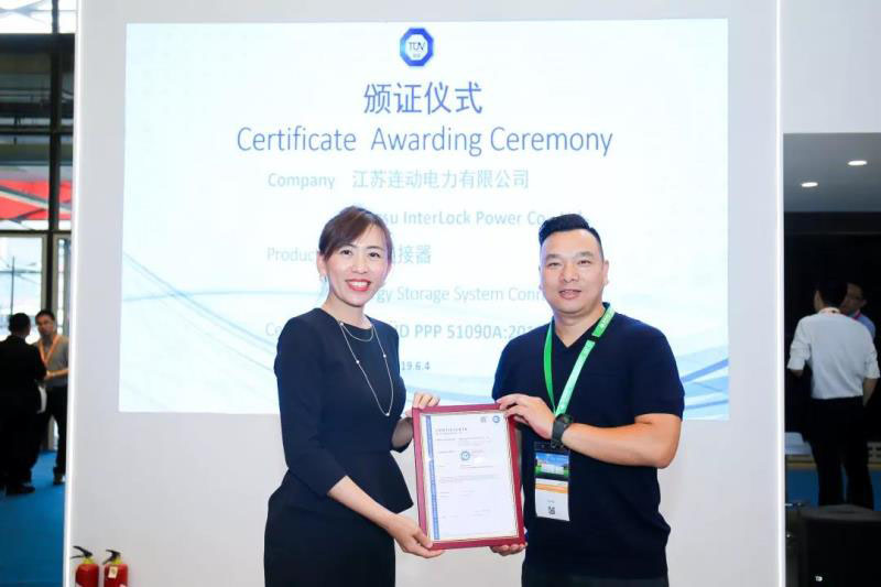 TüV南德大中華區(qū)工業(yè)產(chǎn)品服務(wù)部銷售總監(jiān)李蕊女士為江蘇連動電力的LD-EV-200系儲能系統(tǒng)專用連接器頒發(fā)TüV南德PPP 51090A:2018認(rèn)證證書
