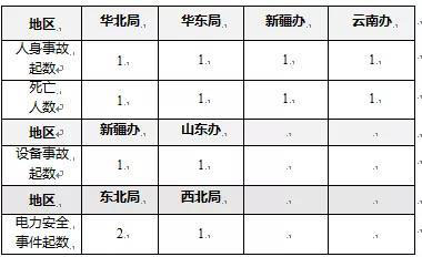 (四)按地區(qū)分布統(tǒng)計:按照國家能源局派出能源監(jiān)管機(jī)構(gòu)監(jiān)管區(qū)域統(tǒng)計,一季度,華北局、華東局、新疆辦和云南辦所轄區(qū)域各發(fā)生1起電力人身傷亡責(zé)任事故、死亡1人,其余14個派出機(jī)構(gòu)未發(fā)生人生傷亡責(zé)任事故。新疆辦和山東辦所轄區(qū)域分別發(fā)生1起電力設(shè)備事故,東北局發(fā)生2起電力安全事件,西北局發(fā)生1起電力安全事件。
