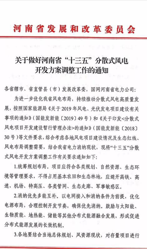 中國儲(chǔ)能網(wǎng)訊:河南省發(fā)布《關(guān)于做好河南省“十三五”分散式風(fēng)電開發(fā)方案調(diào)整工作的通知》,將對(duì)2017年發(fā)布原“十三五”分散式風(fēng)電開發(fā)方案做出調(diào)整,原開發(fā)方案涉及共124個(gè)項(xiàng)目,總規(guī)模210.7萬千瓦。
