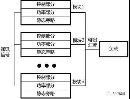 分布式是早期模塊化UPS經(jīng)常使用的一種架構(gòu)。此類模塊化UPS系統(tǒng)層面上等價(jià)于數(shù)臺(tái)獨(dú)立的UPS直接并聯(lián),其功率模塊利用小型UPS改造而成,可自主獨(dú)立工作,其特點(diǎn)是:①除整流、逆變的控制外,均流與邏輯切換也由內(nèi)部控制單元控制;②內(nèi)置容量與功率模塊容量一致的靜態(tài)旁路,在旁路模式時(shí),由每個(gè)模塊內(nèi)的靜態(tài)旁路共同承擔(dān)負(fù)載。