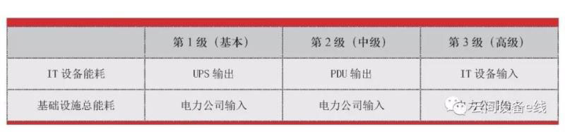 TGG給出了PUE計(jì)算時(shí)的三種測(cè)量采集方法。數(shù)據(jù)中心總耗電量Pt都是電力公司對(duì)數(shù)據(jù)中心的輸入。如果數(shù)據(jù)中心所在的建筑物是多用途的,必須對(duì)數(shù)據(jù)中心的總耗能進(jìn)行識(shí)別,需要減去辦公區(qū)域的用電。但是用于數(shù)據(jù)中心技術(shù)支持的總控中心的用電必須包括在內(nèi)。IT設(shè)備總耗電量PIT的采集點(diǎn)有三種:第1級(jí)是基本級(jí)別,采集點(diǎn)是UPS的輸出;第2級(jí)是中級(jí)級(jí)別,采集點(diǎn)是機(jī)房?jī)?nèi)配電柜的輸出;第3級(jí)是高級(jí)級(jí)別,采集點(diǎn)是機(jī)柜內(nèi)電源插座的輸出,也就是IT設(shè)備的輸入,具體見(jiàn)表1。這三種計(jì)算方法的采集點(diǎn)對(duì)電力使用的功耗或電量的采集的顆粒度要求逐級(jí)提高。目前,我國(guó)多數(shù)數(shù)據(jù)中心采用的是第1級(jí)的采集和計(jì)算方式。因此,得到的PUE數(shù)值也比第2級(jí)和第3級(jí)數(shù)值更低。