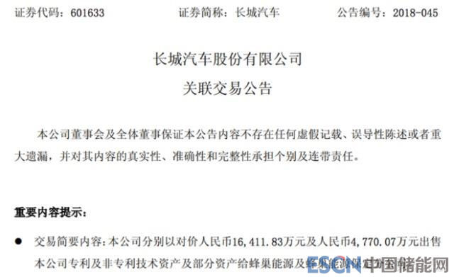 中國儲(chǔ)能網(wǎng)訊:據(jù)長城汽車公布,該公司于近日分別以對(duì)價(jià)約人民幣1.64億元及4770.07萬元出售123項(xiàng)公司專利、非專利技術(shù)資產(chǎn)及部份資產(chǎn)給蜂巢能源、蜂巢能源保定分公司。
