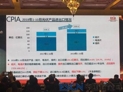 在國際市場方面,1-10月份,進出口情況呈現增長態(tài)勢。增長率14.6%。從去年開始出口額第一次走出負增長。硅片和電池片表現出價減量增。組件出口額、出口量均上升。組件出口額回升80%,9月份就已經超過去年全年出口額。