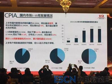 中國光伏行業(yè)協會副理事長兼秘書長王勃華在演講中表示,制造端1-9月產能利用情況分化明顯,體量大的企業(yè)全年利用率保持在70%以上,體量小的不到50%。市場情況,國內1-10月份新增裝機約36GW,累計裝機超過165GW,集中式下降約四成。前三季度分布式僅有2%的增長。