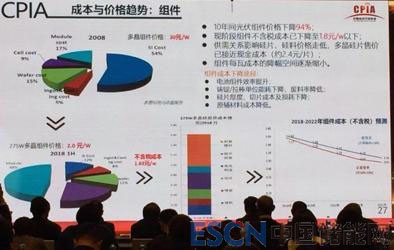 價格趨勢上,同步制造端,產業(yè)鏈四個制造端價格下降非常快,其中比較典型的隆基,一年內9次降價。王勃華表示,產業(yè)發(fā)展的速度非常快,2022年,組件成本可降低為1元/W。預計2022年仍會有30%左右的下降,主要表現在技術方面。