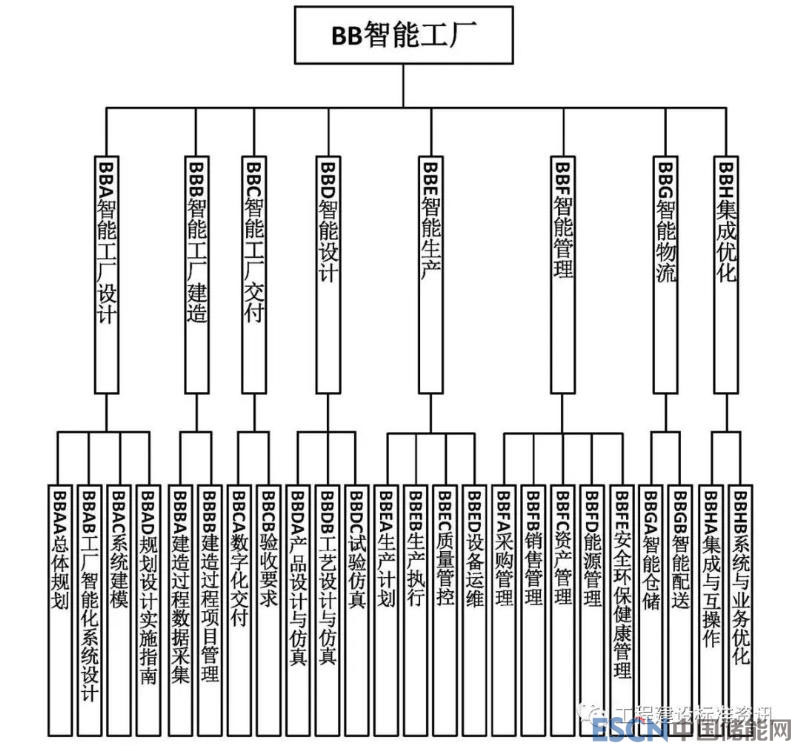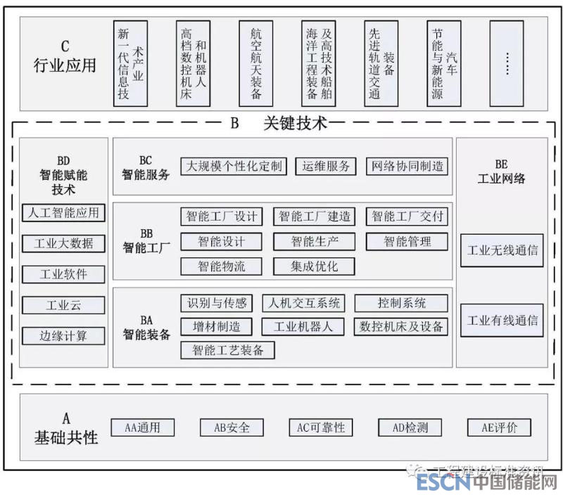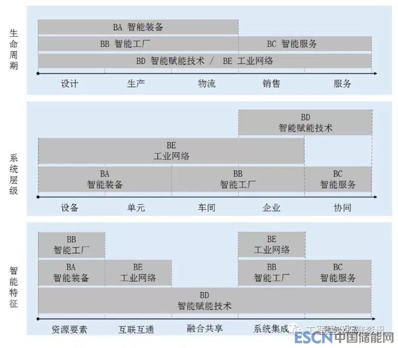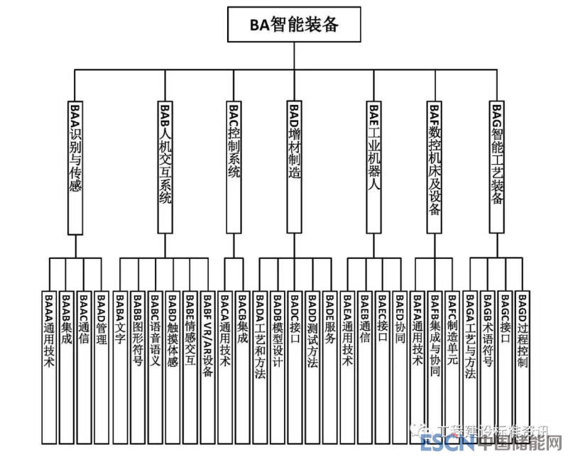 B關(guān)鍵技術(shù)中包括BA智能裝備、BB智能工廠、BC智能服務(wù)、BD智能賦能技術(shù)、BE工業(yè)網(wǎng)絡(luò)等五大類標準。其中BA智能裝備主要對應(yīng)生命周期維度的設(shè)計、生產(chǎn)和物流,系統(tǒng)層級維度的設(shè)備和單元,以及智能特征維度中的資源要素;BB智能工廠主要對應(yīng)生命周期維度的設(shè)計、生產(chǎn)和物流,系統(tǒng)層級維度的車間和企業(yè),以及智能特征維度的資源要素和系統(tǒng)集成;BC智能服務(wù)主要對應(yīng)生命周期維度的銷售和服務(wù),系統(tǒng)層級維度的協(xié)同,以及智能特征維度的新興業(yè)態(tài);BD智能賦能技術(shù)主要對應(yīng)生命周期維度的全過程,系統(tǒng)層級維度的企業(yè)和協(xié)同,以及智能特征維度的所有環(huán)節(jié);BE工業(yè)網(wǎng)絡(luò)主要對應(yīng)生命周期維度的全過程,系統(tǒng)層級維度的設(shè)備、單元、車間和企業(yè),以及智能特征維度的互聯(lián)互通和系統(tǒng)集成。