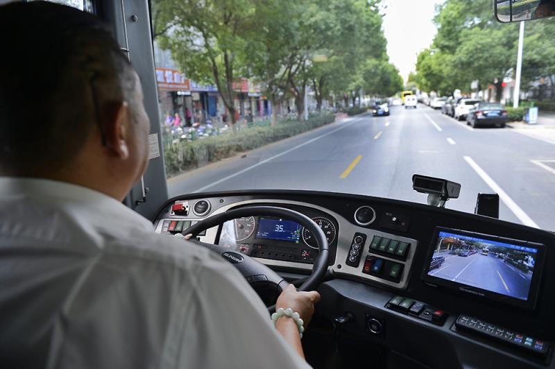 司機(jī)駕駛一輛氫燃料電池大客車上路。