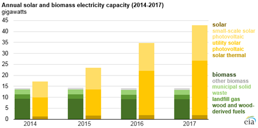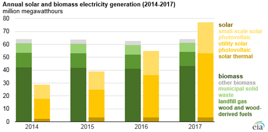 中國儲能網(wǎng)訊:2017年美國太陽能發(fā)電量達到77000 GWh,生物質(zhì)能發(fā)電量為64000GWh,太陽能年發(fā)電量首次超過生物質(zhì)能發(fā)電。在可再生能源中,2017年只有水電和風電的發(fā)電量出現(xiàn)了增長,分別為300000GWh和254000GWh。 近年來生物質(zhì)能發(fā)電裝機量保持相對不變,而太陽能發(fā)電量持續(xù)增長。
