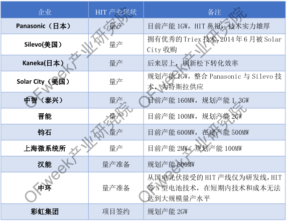 OFweek產(chǎn)業(yè)研究院數(shù)據(jù)顯示,在大規(guī)模量產(chǎn)方面,首屈一指的當然是日本三洋,現(xiàn)有產(chǎn)能1GW,量產(chǎn)效率達23%。除此之外,有較成熟HIT技術(shù)的還有Keneka、Sunpreme、Solarcity、福建均石、晉能、中智(泰興)、漢能等企業(yè)。