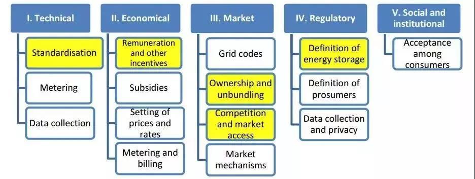 發(fā)展社區(qū)儲能模式亟需解決三方面問題,分別是儲能系統(tǒng)的安全協(xié)調(diào)運行,行之有效的商業(yè)模式,有利的制度和規(guī)則環(huán)境。上表是儲能產(chǎn)業(yè)發(fā)展面臨的主要障礙,黃色部分為與社區(qū)儲能模式最密切相關(guān)的方面。其中標(biāo)準(zhǔn)化是確保各類儲能用戶安全運行并與電網(wǎng)有效互動的前提;市場準(zhǔn)入是市場主體構(gòu)建復(fù)雜商業(yè)模式的前提,收益機(jī)制和激勵政策則將會幫助投資者把市場準(zhǔn)入的價值最大化;明確“儲能”的定義,對于商業(yè)主體而言,將直接影響其能量消費稅率的水平,對TSO/DSO而言,將直接影響其對于儲能的資產(chǎn)所有權(quán)。