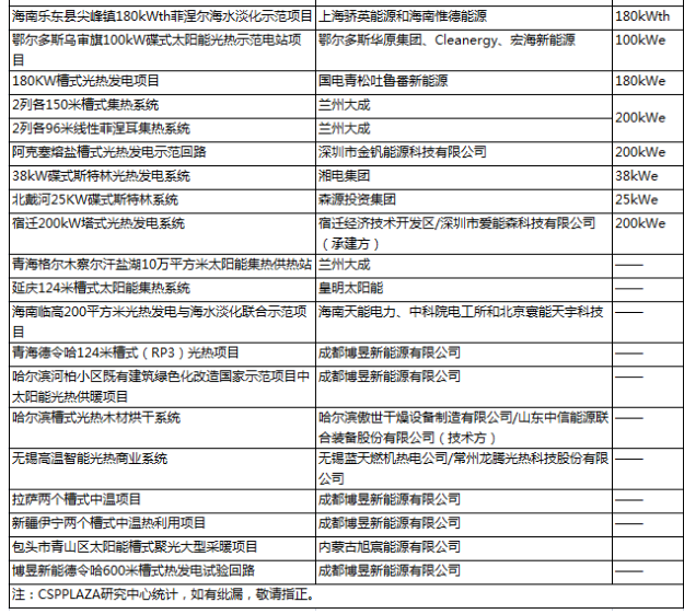 其中,純發(fā)電項(xiàng)目的總裝機(jī)約為41MWe,除了華強(qiáng)兆陽(yáng)張家口一號(hào)15MW菲涅爾光熱電站、中控德令哈10MW塔式光熱電站和首航節(jié)能敦煌10MW塔式光熱電站具有商業(yè)化示范規(guī)模以外,其它均為小型的示范和實(shí)驗(yàn)性項(xiàng)目。此外,聚光光熱熱利用領(lǐng)域也在不斷發(fā)展,用于取暖、供熱、烘干等領(lǐng)域的聚光光熱項(xiàng)目不斷增多。