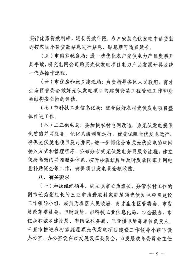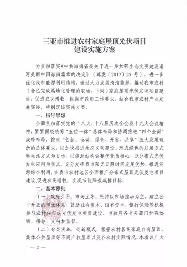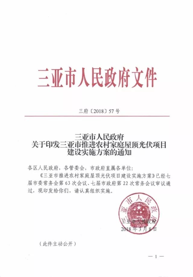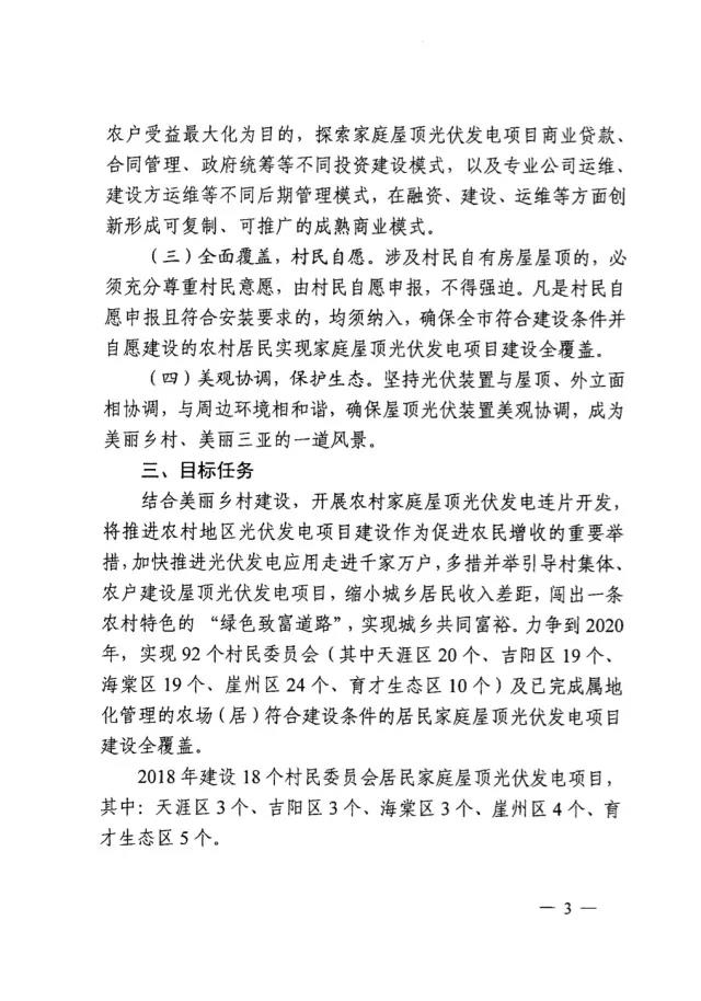 為進(jìn)一步優(yōu)化我市能源利用結(jié)構(gòu),大力發(fā)展清潔能源,推動(dòng)我市農(nóng)村家庭屋頂光伏發(fā)電項(xiàng)目建設(shè),促進(jìn)農(nóng)民增收,我市正式印發(fā)了《三亞市推進(jìn)農(nóng)村家庭屋頂光伏項(xiàng)目建設(shè)實(shí)施方案》,力爭(zhēng)到2020年,實(shí)現(xiàn)92個(gè)村民委員會(huì)及已完成屬地化管理的農(nóng)場(chǎng)(居)符合建設(shè)條件的居民家庭屋頂光伏發(fā)電項(xiàng)目建設(shè)全覆蓋。