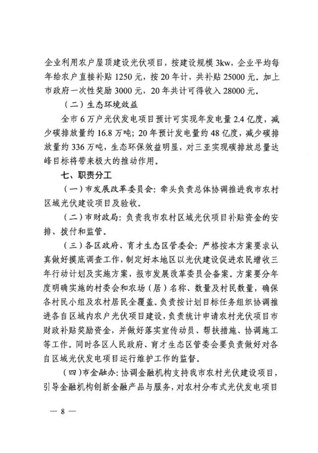 在三亞推廣建設(shè)光伏發(fā)電項(xiàng)目,可以充分發(fā)揮陽(yáng)光日照時(shí)間充足的優(yōu)勢(shì),以光伏發(fā)電項(xiàng)目促進(jìn)我市的節(jié)能減排和低碳城市建設(shè)??鄢蚜腥肴齺喪泄夥鲐殞m?xiàng)實(shí)施的貧困戶和房屋不符合建設(shè)條件的農(nóng)戶,估計(jì)需實(shí)施農(nóng)村家庭屋頂光伏發(fā)電項(xiàng)目建設(shè)的農(nóng)戶約6萬(wàn)戶,以6萬(wàn)戶3Kw光伏發(fā)電項(xiàng)目計(jì)算,預(yù)計(jì)可實(shí)現(xiàn)年發(fā)電量2.4億度,減少碳排放量約16.8萬(wàn)噸;20年預(yù)計(jì)發(fā)電量約48億度,減少碳排放量約336萬(wàn)噸,生態(tài)環(huán)保效益明顯,對(duì)三亞實(shí)現(xiàn)碳排放總量達(dá)峰目標(biāo)將帶來極大的推動(dòng)作用。