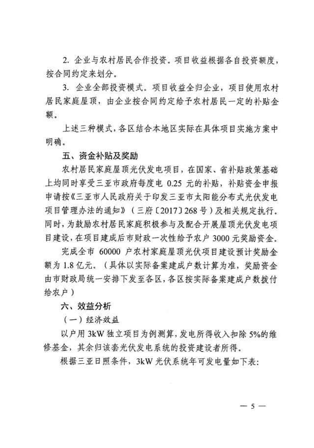 方案中提到,我市的農(nóng)村居民家庭屋頂光伏發(fā)電項(xiàng)目,在享受國(guó)家補(bǔ)貼政策基礎(chǔ)上均同時(shí)享受三亞市政府每度電0.25元的補(bǔ)貼,補(bǔ)貼資金申報(bào)申請(qǐng)按《三亞市人民政府關(guān)于印發(fā)三亞市太陽(yáng)能分布式光伏發(fā)電項(xiàng)目管理辦法的通知》及相關(guān)規(guī)定執(zhí)行。根據(jù)《三亞市太陽(yáng)能分布式光伏發(fā)電項(xiàng)目管理辦法》的規(guī)定,我市分布式光伏發(fā)電項(xiàng)目的補(bǔ)貼采取后補(bǔ)助方式,在分布式光伏發(fā)電項(xiàng)目驗(yàn)收合格并投產(chǎn)滿1年后開始補(bǔ)助,補(bǔ)助時(shí)間為2020年前在三亞市行政轄區(qū)內(nèi)建成的符合條件的分布式光伏發(fā)電項(xiàng)目,且在項(xiàng)目建成投產(chǎn)后連續(xù)5年可享受相關(guān)財(cái)政補(bǔ)貼。