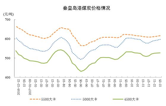 截至12月底,秦皇島5500大卡煤炭平倉(cāng)價(jià)617元/噸,比11月底上漲8元/噸;5000大卡597元/噸,上漲19元/噸;4500大卡527元/噸,上漲15元/噸。