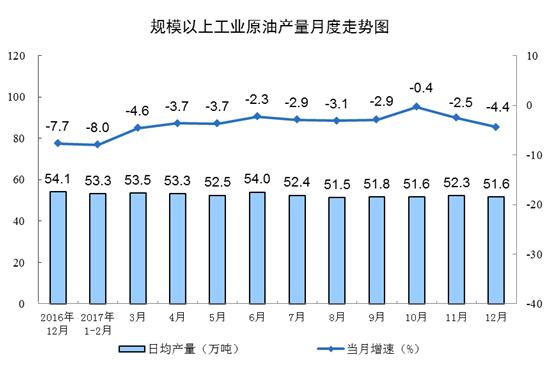 受油田后備資源接替不足、計(jì)劃性減產(chǎn)及寒潮天氣等因素影響,原油生產(chǎn)持續(xù)下降。12月份,原油產(chǎn)量1598.4萬(wàn)噸,同比下降4.4%,降幅比11月份擴(kuò)大1.9個(gè)百分點(diǎn);日均產(chǎn)量51.6萬(wàn)噸,比11月份減少0.8萬(wàn)噸。1-12月份,原油產(chǎn)量1.9億噸,同比下降4.0%。