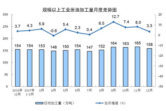 受企業(yè)停產(chǎn)檢修等因素影響,原油加工量增速放緩。12月份,原油加工量同比增長(zhǎng)3.3%,增速比11月份回落4.7個(gè)百分點(diǎn);日均加工量158.4萬(wàn)噸,比11月份減少6.3萬(wàn)噸。主要成品油生產(chǎn)增速均有回落,其中汽油、煤油和柴油產(chǎn)量增速分別比11月份回落7.8、1.3和2.9個(gè)百分點(diǎn)。1-12月份,原油加工量5.7億噸,同比增長(zhǎng)5.0%。