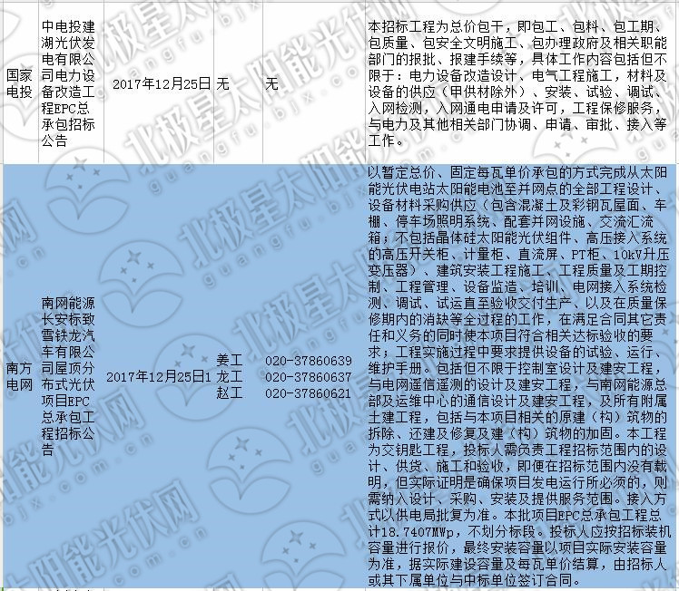 中國儲能網訊:近日,中廣核、華能、國投電力、南方電網官網發(fā)布新的招標公告,涉及分布式光伏、光伏逆變器、光伏組件、EPC、光伏扶貧等的光伏項目光伏招標公告,北極星太陽能光伏網對其進行了匯總,現(xiàn)將招標信息整理如下: