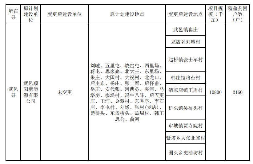 一、同意阜城縣村級光伏扶貧電站建設單位由阜城明鑫光伏電力有限公司變更為阜城縣銀陽新能源公司,并承擔后續(xù)扶貧工作;項目地點由原45個站點調整為43個,取消列入計劃的雙廟楊、建東、李灰、東火、前黎、東王集、李家、王呂、前朱等9個,增加許莊、前宋、后雄、吳莊、韓董、崔城寺頭、謝城寺頭等7個,覆蓋貧困戶數(shù)及規(guī)模不變(詳見附表)。