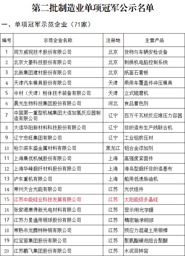 中國儲(chǔ)能網(wǎng)訊:11月28日,工業(yè)和信息化部發(fā)布了《第二批全國制造業(yè)單項(xiàng)冠軍企業(yè)和單項(xiàng)冠軍產(chǎn)品名單公示》。保利協(xié)鑫旗下多晶硅生產(chǎn)企業(yè)江蘇中能入選單項(xiàng)冠軍企業(yè),是名單中僅有的兩家光伏企業(yè)之一。