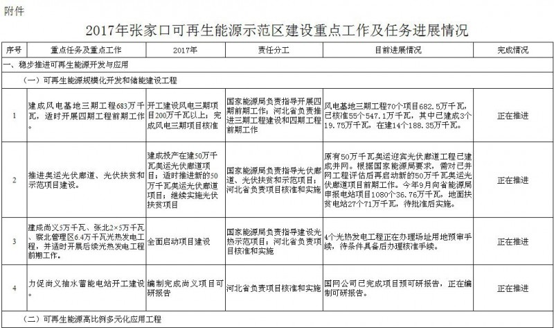 為落實(shí)張家口可再生能源示范區(qū)建設(shè)第四次協(xié)調(diào)推進(jìn)工作會(huì)議要求,河北省和張家口市按照職責(zé)分工,進(jìn)一步細(xì)化任務(wù)、明確責(zé)任、積極跑辦、狠抓落實(shí),相關(guān)工作取得了積極進(jìn)展。