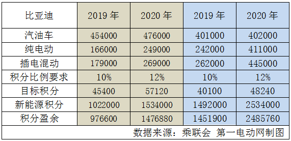 2016年初,比亞迪總裁王傳福在接受媒體采訪時(shí)表示,未來三年新能源車銷量要每年翻倍增長(zhǎng)。根據(jù)乘聯(lián)會(huì)數(shù)據(jù),比亞迪新能源乘用車2015年58869輛、2016年100178輛銷量來看,增速在70%左右。而燃油車則是從2015年393619輛增至2016年的394183,僅微增0.14%。以此推算,2019-2020年比亞迪將產(chǎn)生大量新能源正積分。