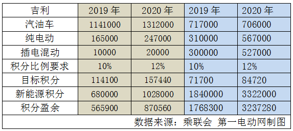 按照“藍(lán)色吉利行動(dòng)”,吉利2020年目標(biāo)銷售200萬(wàn)車,包括20萬(wàn)左右商用車。其中90%的汽車都是新能源汽車,其中插電式混動(dòng)與油電混動(dòng)汽車銷量占比達(dá)到65%,純電動(dòng)汽車銷量占比達(dá)35%,值得注意的是,吉利將約32.5%油電混動(dòng)作為新能源處理,但按照政策它不屬于新能源。這意味著2020年,吉利要銷售109.4萬(wàn)新能源乘用車。如果按照從2016年到2020年每年以一定增速穩(wěn)步遞進(jìn),那么2019-2020年吉利將產(chǎn)生大量新能源正積分。