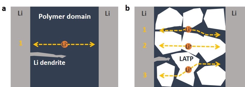 圖2 鋰離子在聚合物固態(tài)電解質(zhì)以及復(fù)合固態(tài)電解質(zhì)的傳輸路徑示意圖