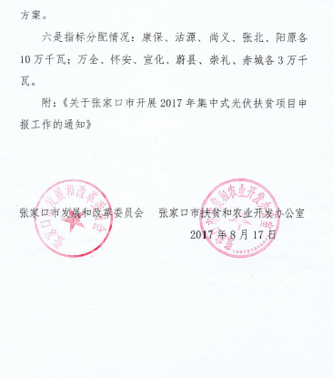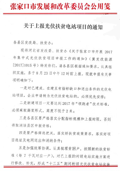 17日,張家口市發(fā)改委、扶貧辦隨之發(fā)布《關(guān)于張家口市開展2017年集中式光伏扶貧項目申報工作的通知》,正式啟動該市2017年集中式光伏扶貧項目申報工作。