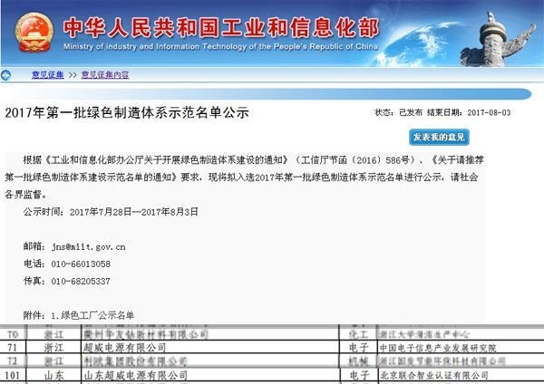 中國儲能網(wǎng)訊:近日,國家工信部網(wǎng)站公示“2017年第一批綠色制造體系示范名單”,超威電源有限公司及其子公司山東超威電源有限公司入選首批國家級綠色工廠企業(yè),在首批9家進(jìn)入名單的電池企業(yè)中占據(jù)2個席位。