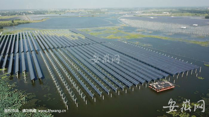 日前,記者也來到潘集區(qū)泥河鎮(zhèn)劉龍村,近距離接觸這里的水面漂浮光伏電站。據(jù)了解,泥河鎮(zhèn)有9個涉及采煤沉陷區(qū),劉龍村也是其中之一。昔日的村莊,現(xiàn)在已經(jīng)變成了一片湖泊,村民早已遷走。但當(dāng)記者乘坐沖鋒舟深入湖泊后,眼前卻出現(xiàn)令人震撼的景象:巨大的光伏發(fā)電板方陣,在寬闊的水面上整齊地排列,一眼望不到邊,在陽光下閃爍著光芒。據(jù)介紹,這里的6000畝水面上,建設(shè)的是全球最大水面漂浮光伏電站。