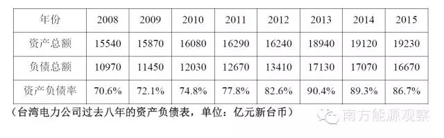 最后,如果核四廢棄,臺(tái)灣電力公司將可能因高額債務(wù)面臨破產(chǎn)危機(jī)。核四目前的投資已經(jīng)接近3000億新臺(tái)幣,如果民進(jìn)黨政府廢棄核四,意味著這筆巨額投資將轉(zhuǎn)化為臺(tái)電的債務(wù),而2015年,臺(tái)電資產(chǎn)總額為19230億,負(fù)債總額16670億元,算上核四的3000億,總債務(wù)將超過資產(chǎn)總額,臺(tái)電屆時(shí)將面臨破產(chǎn)。事實(shí)上,隨著臺(tái)灣燃?xì)獍l(fā)電比例的不斷上升,優(yōu)于臺(tái)灣電價(jià)由政府控制長期限定在較低水平,導(dǎo)致臺(tái)電的財(cái)務(wù)狀況不斷惡化,資產(chǎn)負(fù)債率逐年上升。