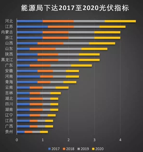 2017-2020年下達(dá)普通地面指標(biāo)54.5GW,每年安排8GW光伏領(lǐng)跑者指標(biāo)。合計(jì)86.5GW。(不含分布式)