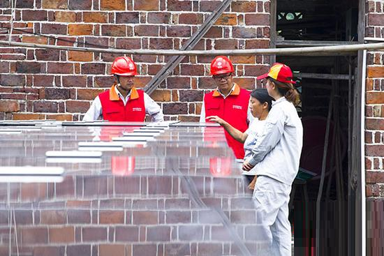 國網(wǎng)株洲供電公司的共產(chǎn)黨員服務隊正在貧困戶鄧曉英家屋頂,詢問入網(wǎng)情況。
