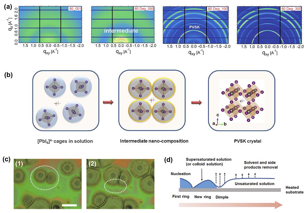 (a)印刷鈣鈦礦從前驅(qū)液到多晶薄膜轉(zhuǎn)換過程中不同階段的GIXD二維衍射圖;(b)鈣鈦礦結(jié)晶的納米中間體組裝模型;(c)印刷薄膜的形貌顯微鏡圖;(d)周期性“結(jié)晶-耗盡”物理模型示意圖。