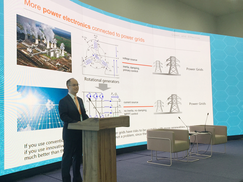 作為大會(huì)主要發(fā)言嘉賓,顧博士在其題為“Advanced power electronics technologies for future energy networks”的主題演講中,重點(diǎn)描繪了未來以高滲透率可再生能源為特征的新型能源網(wǎng)絡(luò),分析了由此帶來的機(jī)會(huì)和挑戰(zhàn),并介紹了一系列以光伏逆變器為核心的先進(jìn)電力電子技術(shù),包括基于SiC和多電平的高效高功率密度的逆變技術(shù),對(duì)電網(wǎng)起支撐作用的VSG技術(shù)和SVG技術(shù),對(duì)光伏組件起保護(hù)和修復(fù)作用的反PID技術(shù)。他認(rèn)為,未來能源互聯(lián)網(wǎng)是大勢所趨,能源互聯(lián)將以勢不可擋的力量與不同行業(yè)產(chǎn)生新的融合,應(yīng)用場景愈發(fā)廣泛。陽光電源將憑借自身在可再生能源領(lǐng)域的成功經(jīng)驗(yàn)和先進(jìn)技術(shù),與傳統(tǒng)行業(yè)攜手,共創(chuàng)美好世界。