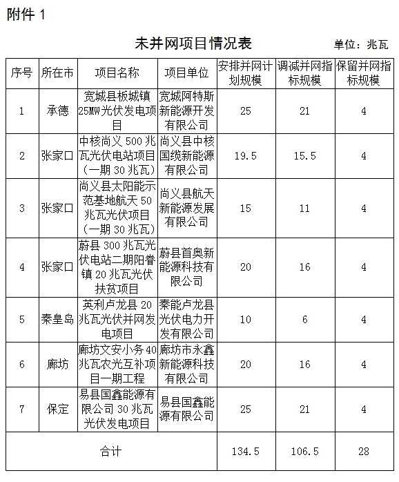 一、6月30日前,列入并網(wǎng)計(jì)劃、未如期并網(wǎng)的項(xiàng)目,保留4兆瓦并網(wǎng)計(jì)劃指標(biāo),用于后續(xù)項(xiàng)目建設(shè),其余部分全部調(diào)減。涉及項(xiàng)目7個(gè)、調(diào)減規(guī)模106.5兆瓦(附件1)。