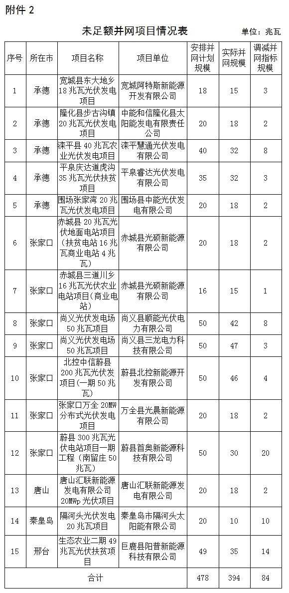 二、6月30日前,列入并網(wǎng)計(jì)劃、已并網(wǎng),但實(shí)際并網(wǎng)規(guī)模小于已安排并網(wǎng)計(jì)劃規(guī)模的,調(diào)減未并網(wǎng)部分指標(biāo)。涉及項(xiàng)目15個(gè)、調(diào)減規(guī)模84兆瓦(附件2)。