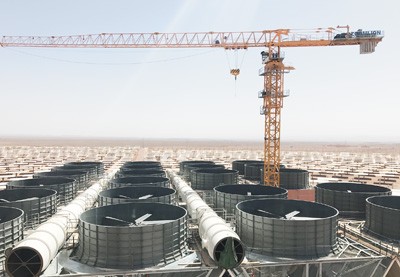 施工現(xiàn)場(chǎng)是1430公頃的荒漠地帶,65萬塊光伏鏡面裝置整齊鋪設(shè),巨大的熔鹽罐和集熱塔分布其間。