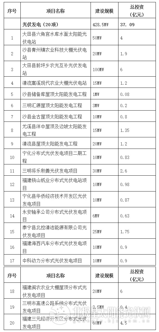 中國儲(chǔ)能網(wǎng)訊:近日,三明市人民政府辦公室關(guān)于印發(fā)三明市“十三五”能源發(fā)展專項(xiàng)規(guī)劃的通知,規(guī)劃羅列了能源建設(shè)的重點(diǎn)項(xiàng)目共72項(xiàng),包括核電、光伏發(fā)電、風(fēng)力發(fā)電、水力發(fā)電、火力發(fā)電、變電站、天然氣、煤礦及電動(dòng)汽車充換電基礎(chǔ)設(shè)施等項(xiàng)目。其中指出,“十三五”期間規(guī)劃光伏發(fā)電項(xiàng)目20個(gè),共428.5MW,計(jì)劃總投資37.09億元。