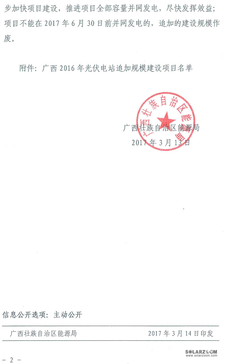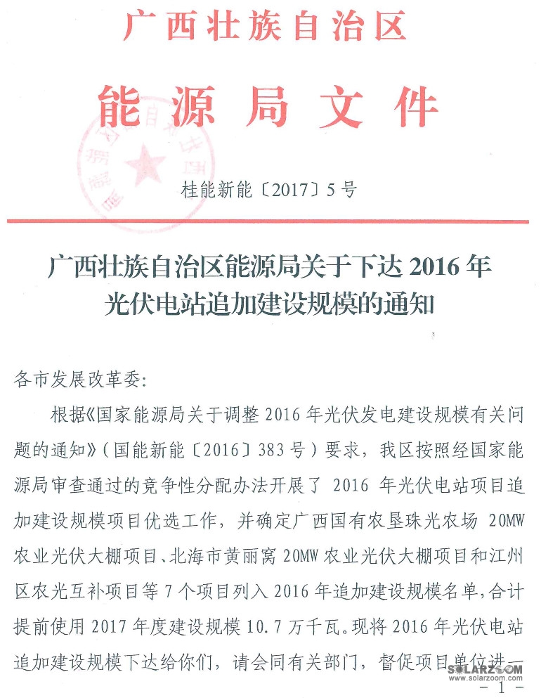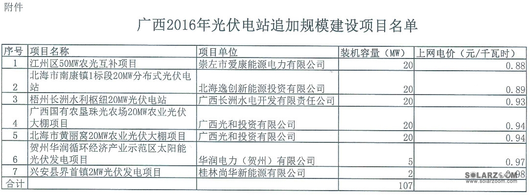 中國(guó)儲(chǔ)能網(wǎng)訊:近日,廣西能源局下達(dá)《2016年光伏電站追加規(guī)模的通知》。《通知》指出此次廣西共有7個(gè)項(xiàng)目列入2016年 追加建設(shè)規(guī)模名單,合計(jì)提前使用2017年度建設(shè)規(guī)模107MW。項(xiàng)目不能在2017年6月30日前并網(wǎng)發(fā)電的,追加的建設(shè)規(guī)模作廢。