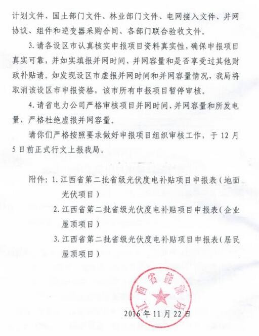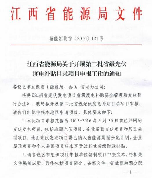 2016年6月24日,江西能源局發(fā)文下達(dá)該省2016年新增400MW普通光伏電站新增建設(shè)規(guī)模的預(yù)分配方案,該指標(biāo)主要分配給已經(jīng)同意開展前期工作或已經(jīng)承諾建設(shè)計(jì)劃的項(xiàng)目(可點(diǎn)擊查看光伏們?nèi)涨皥?bào)道江西2016年400MW普通光伏建設(shè)規(guī)模預(yù)分配完成,16個(gè)項(xiàng)目進(jìn)入名單并要求今年建成并網(wǎng))。
