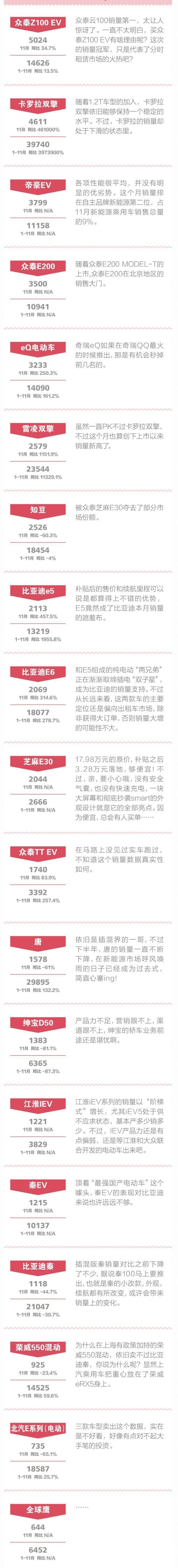 比如說,新能源汽車圈的一眾老將新兵肯定沒有想到,11月新能源的KO榜竟然是眾泰領(lǐng)跑,眾泰Z100 EV拿到榜首之位,真心是想不到啊,難道是分時租賃市場真的是出現(xiàn)了“我要爆發(fā)”的苗頭?而且眾泰竟然成了新能源市場的贏家,旗下四款車型進(jìn)入11月銷量前十強(qiáng),銷量總和為1.23萬輛,占據(jù)33.04%的市場份額。這讓上個月還是銷量第一的比亞迪不得不在內(nèi)心吶喊,“我不服!”