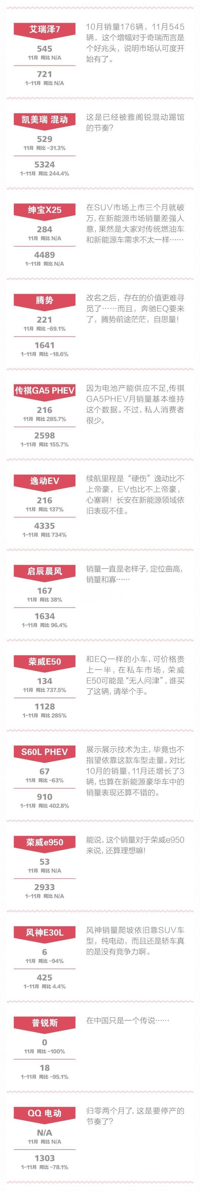 中國儲能網(wǎng)訊:乘聯(lián)會數(shù)據(jù)顯示,新能源乘用車市場持續(xù)升溫,2016年11月新能源乘用車銷量達(dá)到4.18萬輛,總體同比增速35%。其中純電動同比增116%,但插混同比下降40%;11月的普混銷量0.96萬輛,是插混0.45萬輛的兩倍。而且對比之前的數(shù)據(jù)發(fā)現(xiàn),純電動車型增長迅速,各款插電混合車型都有不同幅度的下滑,顯然沒有了“我是網(wǎng)紅”的派頭了。