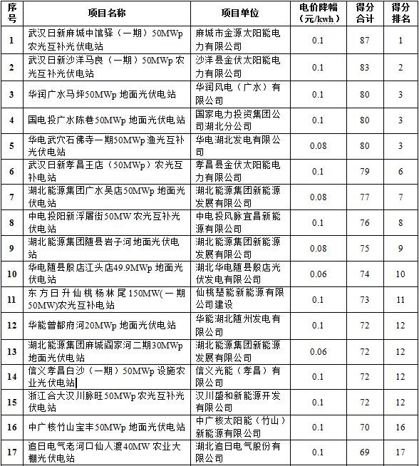 湖北省工程咨詢公司組織省內(nèi)外專家,對(duì)16個(gè)市州申報(bào)的126個(gè)項(xiàng)目(總?cè)萘?32萬千瓦)進(jìn)行了綜合評(píng)定和排序,經(jīng)省能源局局長(zhǎng)辦公會(huì)研究,現(xiàn)對(duì)比選排序前60個(gè)項(xiàng)目予以公示。其余項(xiàng)目可向湖北省工程咨詢公司咨詢項(xiàng)目得分和排序。