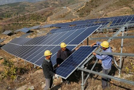 10月26日,工人在秦皇島市海港區(qū)何莊村中硅光伏發(fā)電站建設工地安裝光伏發(fā)電板