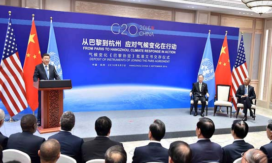 9月3日,國(guó)家主席習(xí)近平同美國(guó)總統(tǒng)奧巴馬、聯(lián)合國(guó)秘書(shū)長(zhǎng)潘基文在杭州共同出席氣候變化《巴黎協(xié)定》批準(zhǔn)文書(shū)交存儀式。新華社記者李濤攝