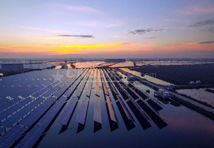 2016年8月23日,無人機(jī)正在華東最大的水上光伏發(fā)電基地,位于江蘇興化李中鎮(zhèn)蘇宋村的華電(興化)太陽能發(fā)電項(xiàng)目檢查光伏設(shè)備運(yùn)行情況。