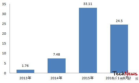 數(shù)據(jù)顯示,2013年,我國(guó)新能源汽車銷量?jī)H有1.76萬(wàn)輛,到2015年我國(guó)新能源汽車銷量已經(jīng)超過(guò)33萬(wàn)輛,同比增長(zhǎng)超過(guò)300%,2016年1至8月,我國(guó)新能源汽車銷量為24.5萬(wàn)輛,同比增長(zhǎng)115.6%。