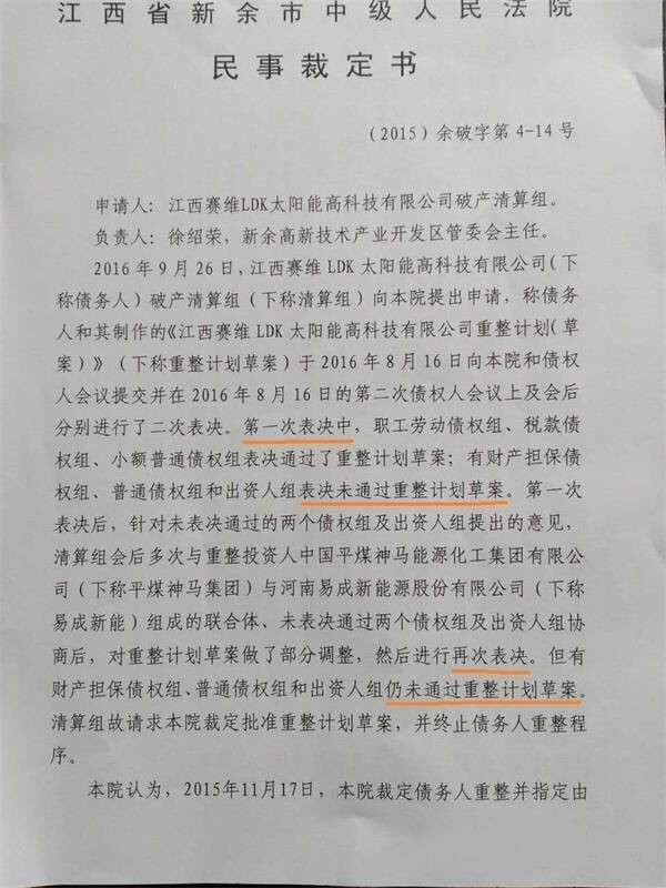至此,賽維用8年時(shí)光走完了在紐交所上市到退市的生命里程。隨后,開(kāi)曼法院裁定實(shí)施破產(chǎn)清算。8月26日,債權(quán)人新余市城東建設(shè)投資總公司向新余中院申請(qǐng)對(duì)賽維實(shí)施重組,11月17日,新余中院裁定重組,賽維國(guó)內(nèi)債務(wù)重組開(kāi)始。
